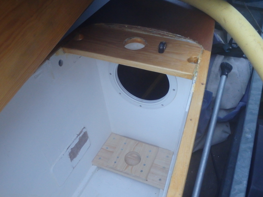 In the photo you can also see where the old mast step was, the holes in the mast partner for the beam lashing, and a plastic fitting to take the down-haul and secure the rig to the boat. The mast only has to lift an inch to come out of the mast step, so I want it held in firmly.